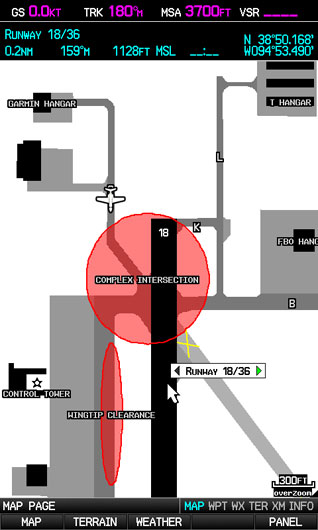 SafeTaxi® is the feature (software with airport diagrams database) for Garmin navigation systems that identifies runways, taxiways, FBOs, and hangars, as well as your aircraft's exact location on the field. SafeTaxi is seamlessly integrated with existing basemap data, so the airport information automatically appears at the appropriate map range setting — with details increasing as the range setting decreases. Since SafeTaxi is geo-referenced, pilots will benefit by seeing their aircraft icon move precisely along the taxiway diagram on their navigation screen. SafeTaxi includes position information for hundreds of airports, and updates are available every 56 days. SafeTaxi is integrated with the existing basemap data and the airport information is automatically appearing.